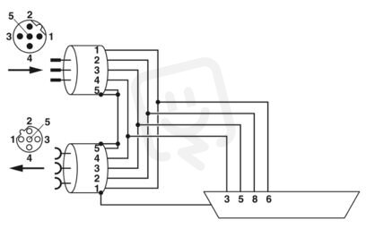 Zástrčka D-SUB, 9pólová, kolík, osazení: 3, 5, 6, 8; dva kabelové přívody M12 (s kódováním B) pod úhlem 35°. Sběrnicový systém DP do12 MBit/s. Zakončovací odpor přes zvláštní terminátor M12.
