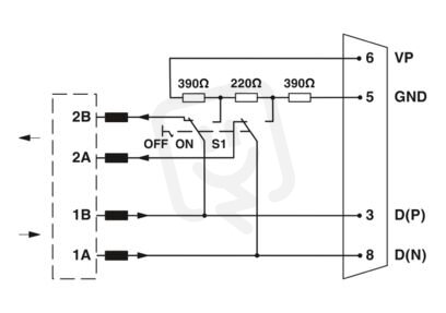 Zástrčka D-SUB, 9pólová, kolík, axiální provedení se dvěma kabelovými přívody, systém sběrnice: Sběrnice PROFIBUS s 12 Mbit/s, zakončovací odpor připojitelný přes posuvný přepínač, osazení kontaktů: 3, 5, 6, 8; konektory s pružinovými svorkami
