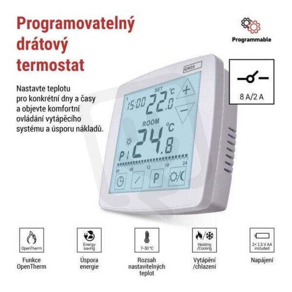 TERMOSTAT DRÁT.PROG. P56A02 najdete v kategoriích Vzduchotechnika a topení, Termostaty, hydrostaty, Termostat s hodinami, Fotovoltaika, vzduchotechnika a topení, výrobce Emos, EAN 8592920149195, kód dodavatele P56A02. Pokojový programovatelný drátový OpenTherm termostat P56A02 EMOS P56A02 nabízíme od 1 ks. Kód EMAS TERMOSTAT DRÁT.PROG. P56A02 je ELSVOS1996033.