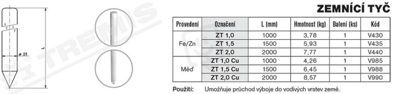 ZT 1,5 Cu zemnící tyč Cu najdete v kategoriích Uzemňovací prvky, Zemnící tyč, Uzemnění, hromosvody a přepěťové ochrany, výrobce Tremis, EAN 8595614724500, kód dodavatele V988. Zemnící tyč ZT 1,5 Cu (měď) TREMIS V988 nabízíme od 1 ks. Kód EMAS ZT 1,5 Cu zemnící tyč Cu je ELHRCU0079007.