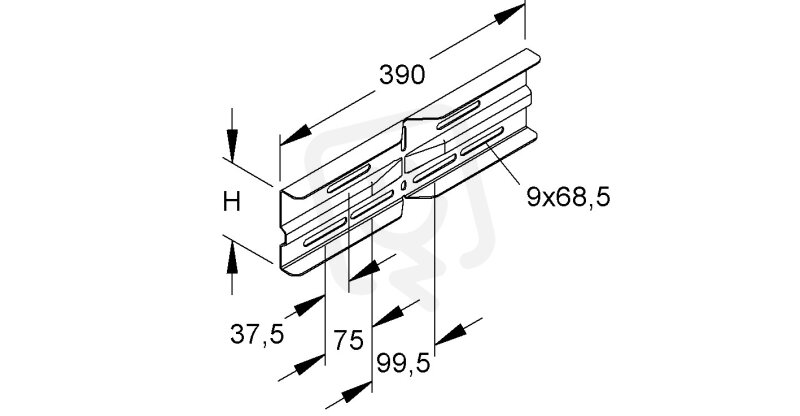 Úhlová spojka, vodorovná, pro provádění vodorovných úhlových spojů průběžných kabelových žlabů/vodičů se širokým rozpětím, včetně odpovídajícího upevňovacího příslušenství z nerezové oceli. Vyrovnání potenciálu se provádí pomocí šroubového spojení s bočnicemi kabelových žlabů/žebříků se širokým rozpětím a bočnicemi tvarovek. Styčná místa musí být v bezprostřední blízkosti podepřeny odpovídající nosnou konstrukcí. Použitelné pro : Kabelové žlaby/žebříky s širokým rozpětím a jejich tvarovky s výškou hrany 105 mm Potřeba : 2 kusy na styčné místo Rozměry (přibližné míry) výška v (světlý vnitřní rozměr) x šířka š : 106,5 x 390 mm Materiál : nerezová ocel, materiál č. 1.4301, AISI 304