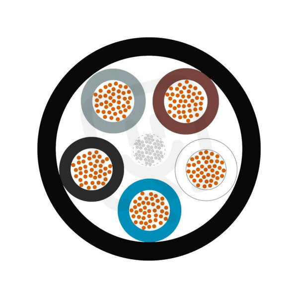 - Konfigurace vodičů: 5×0,34 mm² — pět žil o průřezu 0,34 mm² vhodných pro signálové/napájecí zapojení.