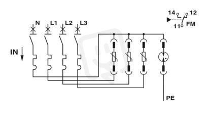 Kombinace z přepěťové ochrany Typ 2 a předjištění svodiče, s dohledem svodiče a předjištění, ve spojení s kontaktem dálkové signalizace. Provedení: 5vodičová soustava (L1, L2, L3, N, PE), montáž na nosnou lištu NS 35