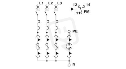 Kombinace z přepěťové ochrany Typ 2 a předjištění svodiče, s dohledem svodiče, ve spojení s ukazatelem stavu a kontaktem dálkové signalizace. Provedení: 5vodičová soustava (L1, L2, L3, N, PE), montáž na 60 mm systémové technice (Systém proudových sběrnic)