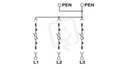 Univerzální výměnný svodič proudu svodič přepětí nab bázi varistoru pro 3fázovou síť napájecího zdroje se společným N a PE (4vodičová soustava: L1, L2, L3, PEN).