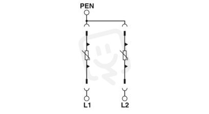 Výměnný svodič přepětí, podle Typu 2 třídy II, pro 2fázové napájecí sítě s kombinovaně položeným PE a N v jednom vodiči (3vodičová soustava: L1, L2, PEN).