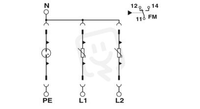 Výměnný svodič přepětí, podle Typu 2 třídy II, pro 2fázové napájecí sítě se samostatným N a PE (4vodičová soustava: L1, L2, N, PE), s kontaktem dálkového hlášení.
