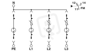 Výměnný svodič přepětí, podle typu 2 Class II, bez svodového proudu pro 3fázové napájecí sítě se samostatným N a PE (5vodičová soustava: L1, L2, L3, N, PE), s kontaktem dálkového hlášení.
