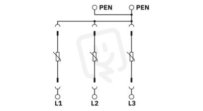 Výměnný svodič přepětí, podle Typu 2 třídy II, pro 3fázové zdroje napájecí sítě s kombinovaně položeným PE a N v jednom vodiči (4vodičová soustava: L1, L2, L3, PEN).