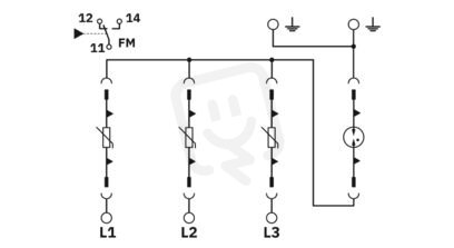 Výměnný svodič přepětí, podle Typu 2 třídy II, pro 3fázové napájecí sítě s kombinovaně položeným PE a N v jednom vodiči (4vodičová soustava: L1, L2, L3, PEN), s kontaktem dálkového hlášení.