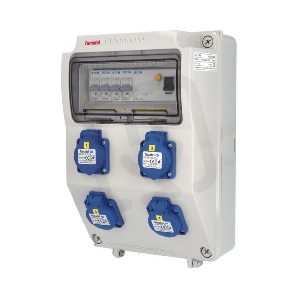 Zásuvková skříň (rozváděč nízkého napětí) FAMATEL vf365-ZSF40000000.1 /3958 IP54 jištěná s chráničem 63/4/003-A, zásuvky 4x230V/16A (s ochranným kolíkem dle ČSN), jistící přístroje FAMATEL 10kA: 4xKBS1B16 B16/1, na vstupu AUR8463A030 63/4/003-A (citlivost na reziduální proud 30mA), použité pouzdro: 3958 - celkem k dispozici 9mod. míst, rozměry: 330x215x155mm, plastová, materiál ABS, IK08, zkouška žhavou smyčkou 650°C, bezhalogenová a UV odolná, montáž na povrch, barva: světle šedá, rozsah teplot -25°C +85°C, aplikované normy: IEC 61439-3 (Rozváděče nízkého napětí - Část 3: Rozvodnice určené k provozování laiky (DBO), balení: 1ks (fólie), zásuvky na 230V/16A s ochranným kolíkem dle ČSN, polykarbonátové okénko, jistící prvky FAMATEL, PE svorkovice součástí (6x16mm2), N svorkovice součástí (6x16mm2), hladké stěny (bez prolisů) pro vyvrtání vstupního otvoru a následné osazení příslušnou vývodkou (pro CYKY 5x6; 4x10; 5x10 => M25; pro CYKY 5x16 => M32), max. připojitelný vstupní kabel = 4x25 nebo 5x16 (Cu), dodáno s průvodní dokumentací: štítkem rozváděče, návodem pro obsluhu a montáž, krycím listem (charakteristiky rozhraní), protokolem o kusové zkoušce, ES prohlášením o shodě, schématem zapojení a zkouškou oteplení pro rozváděče nízkého napětí. Recyklační poplatek je zahrnut v ceně výrobku