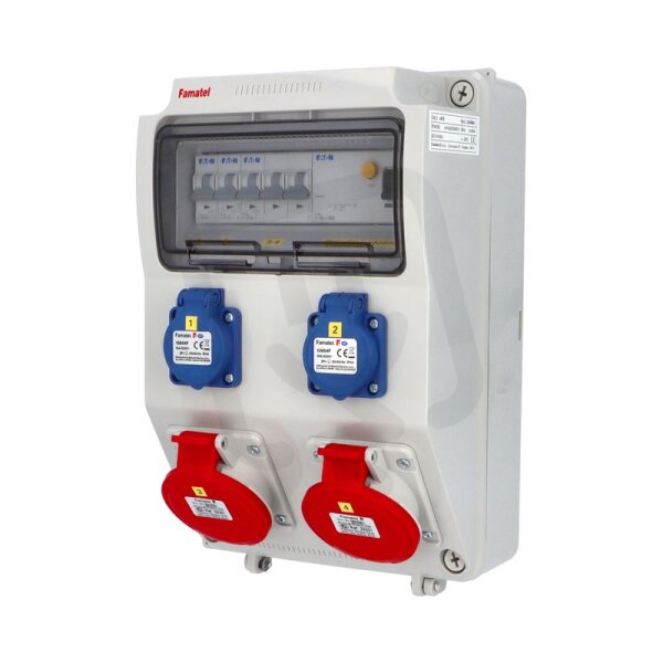 Zásuvková skříň (rozváděč nízkého napětí) FAMATEL vf410-ZSF20200000.1 /3958 IP54 jištěná s chráničem 63/4/003-A, zásuvky 2x230V/16A (s ochranným kolíkem dle ČSN), 2x400V/16A/5pól, jistící přístroje FAMATEL 10kA: 2xKBS1B16 B16/1, 1xKBS3B16 B16/3, AUR8463A030 63/4/003-A na vstupu (citlivost na reziduální proud 30mA), použité pouzdro: 3958 - celkem k dispozici 9mod. míst, rozměry: 330x215x155mm, plastová, materiál ABS, IK08, zkouška žhavou smyčkou 650°C, bezhalogenová a UV odolná, montáž na povrch, barva: světle šedá, rozsah teplot -25°C + 85°C, aplikované normy: IEC 61439-3 (Rozváděče nízkého napětí - Část 3: Rozvodnice určené k provozování laiky (DBO), balení: 1ks (fólie), zásuvky na 230V/16A s ochranným kolíkem dle ČSN, polykarbonátové okénko, jistící prvky FAMATEL, PE svorkovnice součástí (6x16mm2), N svorkovnice součástí (6x16mm2), hladké stěny (bez prolisů) pro vyvrtání vstupního otvoru a následné osazení příslušnou vývodkou (pro CYKY 5x6; 4x10; 5x10 => M25; pro CYKY 5x16 => M32), max. připojitelný vstupní kabel = 4x25 nebo 5x16 (Cu), dodáno s průvodní dokumentací: štítkem rozváděče, návodem pro obsluhu a montáž, krycím listem (charakteristiky rozhraní), protokolem o kusové zkoušce, ES prohlášením o shodě, schématem zapojení a zkouškou oteplení pro rozváděče nízkého napětí. Pro montáž na hořlavé podklady je nutné použít nehořlavou podložku. Recyklační poplatek je zahrnut v ceně výrobku