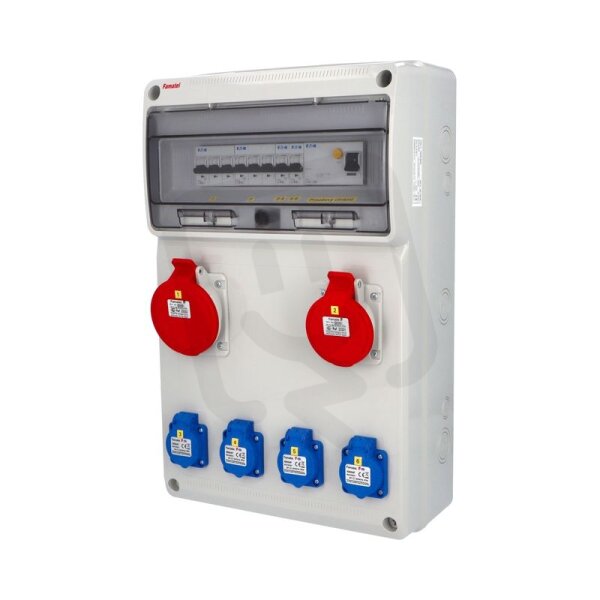 Zásuvková skříň (rozváděč nízkého napětí) FAMATEL vf625-ZSF40101000.1 /3952 IP54 jištěná s chráničem 63/4/003-A, zásuvky 4x230V/16A (s ochranným kolíkem dle ČSN), 1x400V/16A/5pól, 1x400V/32A/5pól, jistící přístroje FAMATEL 10kA: 2xKBS1B16 B16/1, 1xKBS3B16 B16/3, 1xKBS3B32 B32/3, AUR8463A030 63/4/003-A na vstupu (citlivost na reziduální proud 30mA), použité pouzdro: 3952 - celkem k dispozici 16mod. míst, rozměry: 500x330x155mm, plastová, materiál ABS, IK08, zkouška žhavou smyčkou 650°C, bezhalogenová a UV odolná, montáž na povrch, barva: světle šedá, rozsah teplot -25°C + 85°C, aplikované normy: IEC 61439-3 (Rozváděče nízkého napětí - Část 3: Rozvodnice určené k provozování laiky (DBO), balení: 1ks (fólie), zásuvky na 230V/16A s ochranným kolíkem dle ČSN, polykarbonátové okénko, jistící prvky FAMATEL, PE svorkovnice součástí (2ks 2x16mm2+4x10mm2), N svorkovnice součástí (2ks 2x16mm2+4x10mm2), stěny s předlisovanými vstupy pro vyvrtání vstupního otvoru a následné osazení příslušnou vývodkou (pro CYKY 5x6; 4x10; 5x10 => M25; pro CYKY 5x16 => M32), max. připojitelný vstupní kabel = 4x25 nebo 5x16 (Cu), dodáno s průvodní dokumentací: štítkem rozváděče, návodem pro obsluhu a montáž, krycím listem (charakteristiky rozhraní), protokolem o kusové zkoušce, ES prohlášením o shodě, schématem zapojení a zkouškou oteplení pro rozváděče nízkého napětí. Pro montáž na hořlavé podklady je nutné použít nehořlavou podložku