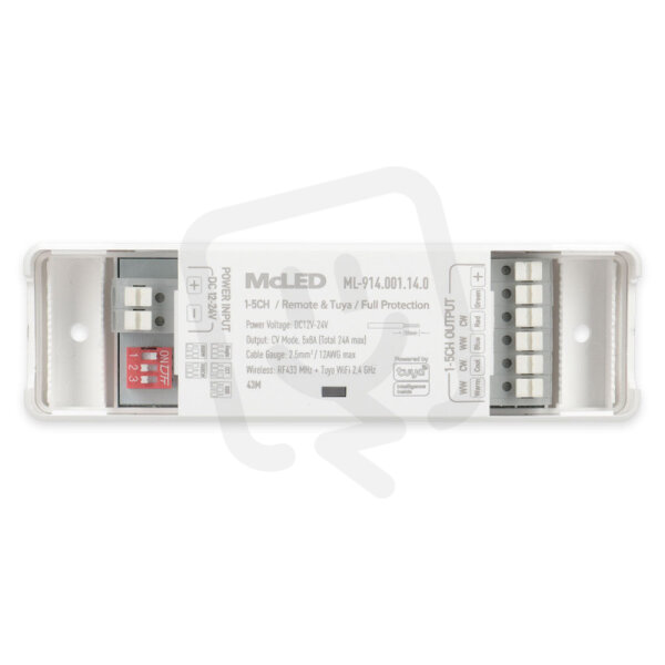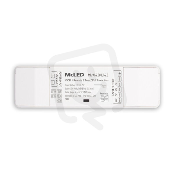 Wifi přijímač pro aplikaci Tuya Smart určený pro stmívání jednobarevných LED pásků / řízení barev RGB / teploty chromatičnosti CCT nebo řízení RGB+CCT LED pásků (ovladač není součástí). Rozměry: 134 x 39 x 24mm. Vstupní napětí: DC 12-24V. Wi-fi: 2,4 GHz. Pozor, párování možné jen na WiFi 2,4 GHz! 5 kanálů s max. zátěží 8A na 1 kanál (= jedna barva R/G/B/WW/CW): 96W/12V, 192W/24V na kanál. Celková max. zátěž 24A: 288W/12V, 576W/24V. Po výpadku napájení si pamatuje poslední nastavenou hodnotu/režim.