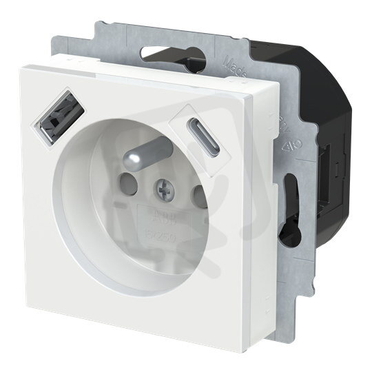 Jedna zásuvka s USB-A (1) a USB-C (1), barva: bílá/ledová bílá (RAL 9003), stupeň krytí IP40, materiál: nerezová ocel / kov, rozměry 71 × 58 × 71 mm (Š×V×H) s min. hloubkou instalační krabice 39,5 mm, napětí 250 V, frekvence 50 Hz, 1 fáze a se smyčkovou funkcí, určená pro montáž šroubem pod omítku.