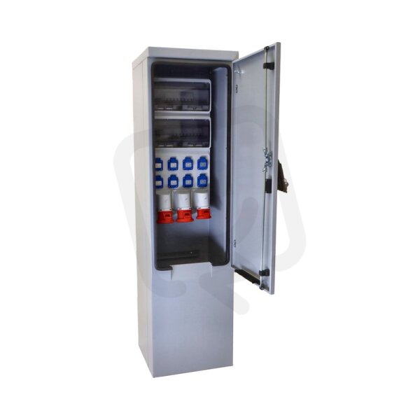 Zásuvková skříň FAMATEL v742ES-ZSF80102000.1 /3977 IP54 jištěná s chráničem 63/4/003-A, zásuvky 8x230V, 1x16/5 úhel 90°, 2x32/5 úhel 90°, přístroje FAMATEL 10kA: 8x KBS1B16 B16/1, 1x KBS3B16 B16/3, 2x KBS3B32 B32/3, AUR8463A030 63/4/003-A na vstupu, použité pouzdro: 3977 - 685x330x155mm, barva: světle šedá. Použitý sloupek: 1500x410x400mm, barva (komaxit) RAL 7040 světle šedá.