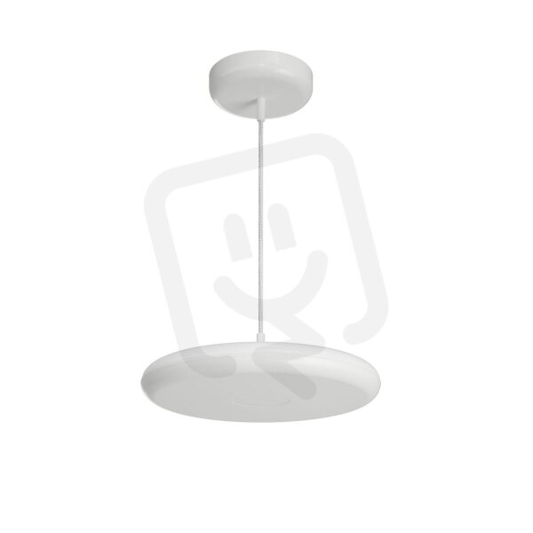 Bílé závěsné LED svítidlo DALI s nepřímým svícením a matovaným PMMA stínidlem. Textilní kabelový závěs s vnitřním nosným lankem o délce 100 cm.